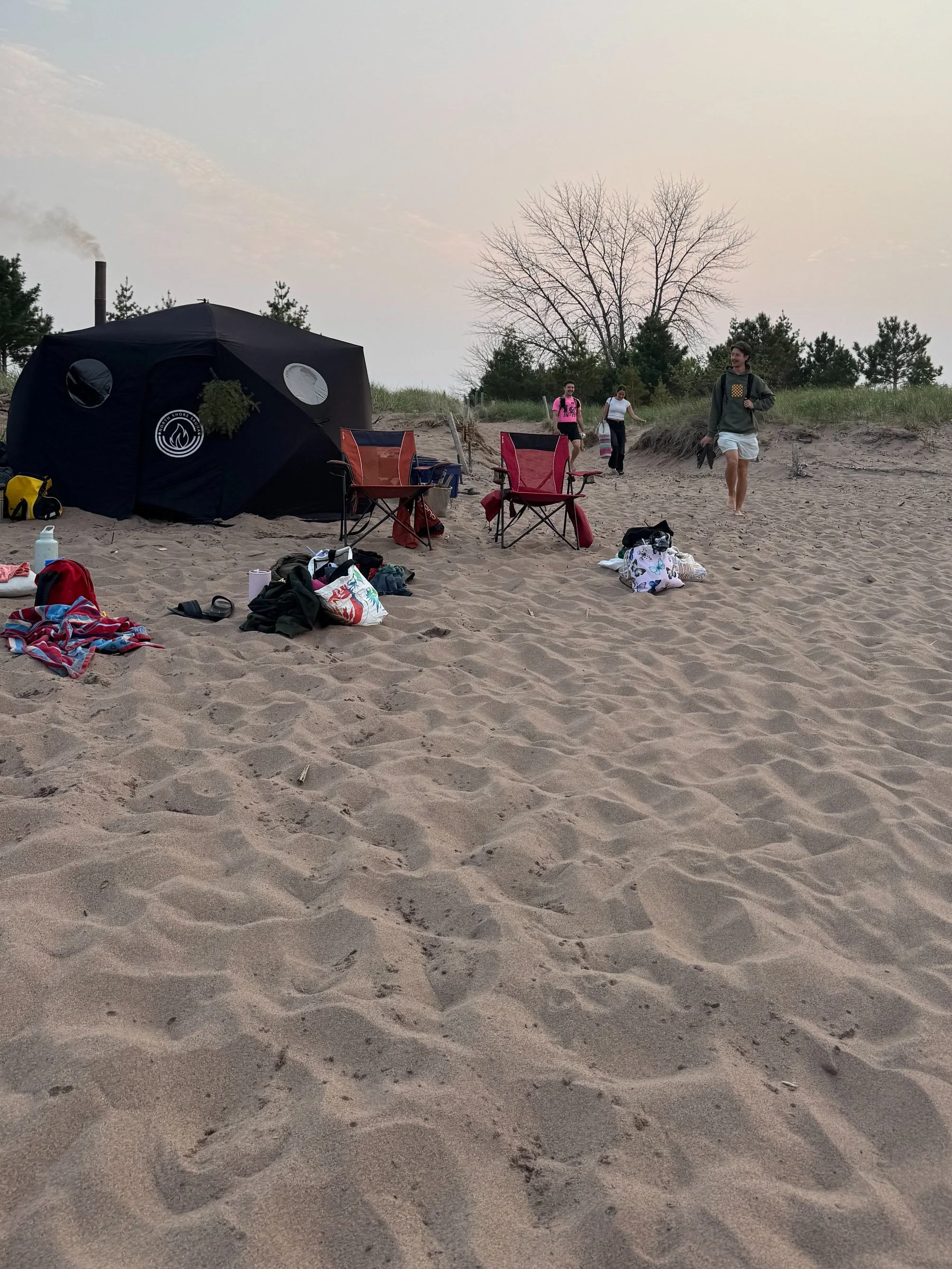 Our public offering is a 60-minute, lightly guided sauna experience held in our cozy, wood-fired tent. Each session welcomes up to eight guests for rounds of steam punctuated by refreshing moments outdoors and the option to take a dip in Lake Superior.